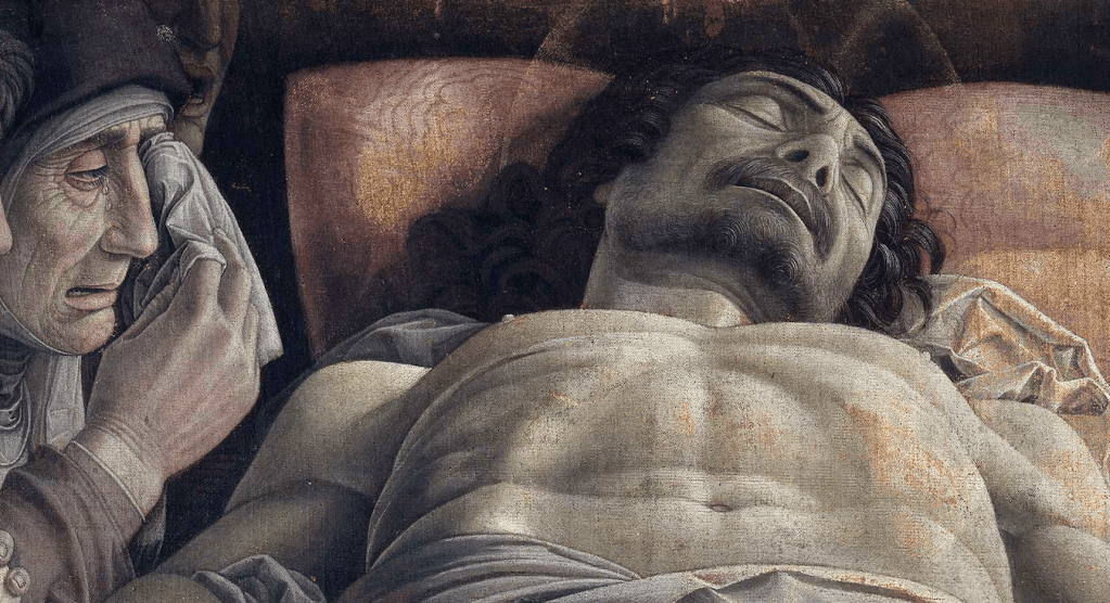 Mantegna, malując Martwego Chrystusa około 1475 roku, uchwycił moment złożenia Chrystusa do grobu. Nie jest jeszcze całkiem owinięty w płótno, kobiety jeszcze przy nim są. Mantegna daleki jest od idealizowania tej sceny. Maluje surową rzeczywistość – zimne światło, ciało pozbawione życia.