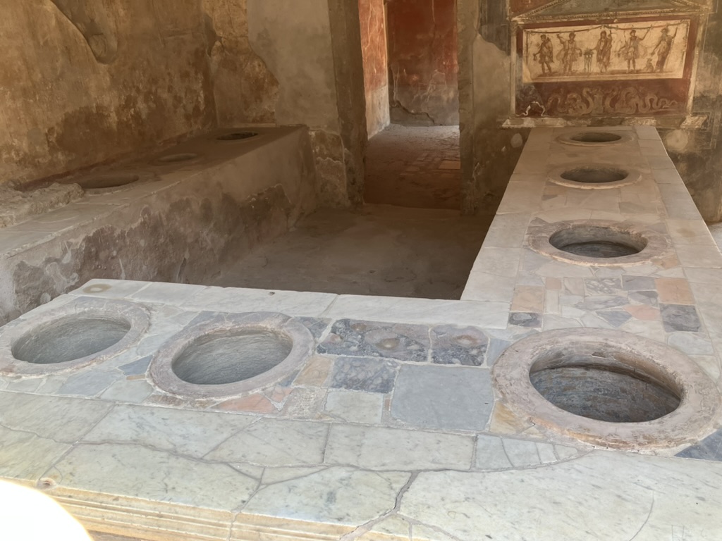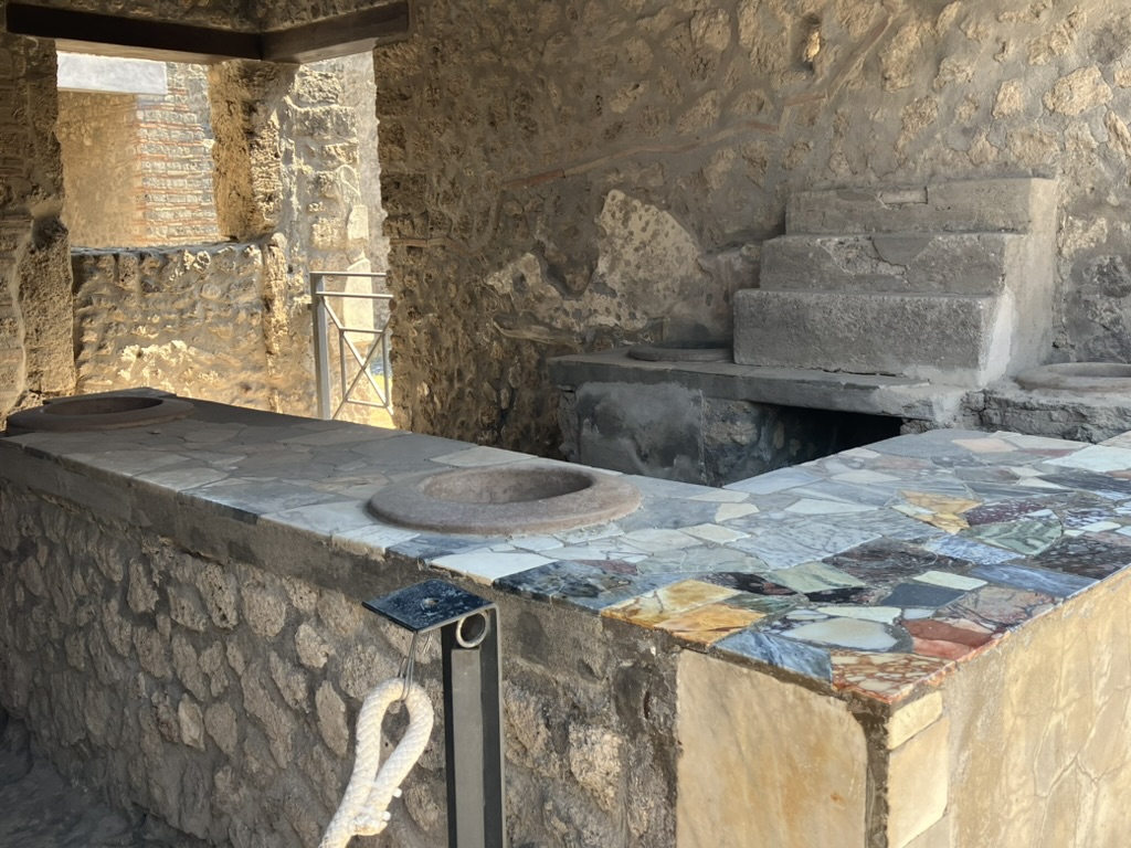 O ile dziś jadamy w restauracjach czy kawiarniach, Pompejańczycy mieli swoje bary. Rozpoznajemy je po charakterystycznych kamiennych blatach z zagłębieniami na gorące posiłki lub napoje. Archeolodzy odkryli niektóre z nich z resztkami przypraw czy naczyń. W blatach znajdziemy też wydrążone otworki na monety: wielkości otworów pokrywały się z nominałami monet. Przechowując je w ten sposób można było je od razu szybko przeliczyć. Oznacza to, że ruch był duży – obracanie pieniędzmi wymagało pewnej sprawności. Czy można założyć, że już wtedy istnieli miłośnicy jedzenia na mieście? Owszem, ale to nie jedyny powód. W biedniejszych domach nie było kuchni umożliwiających przygotowanie gorącego posiłku, wymuszało to niejako jedzenie na zewnątrz. Co takiego mogli jeść? Pizzę? Panini? Nie, raczej gulasz, dania na bazie fasoli i mięsa oraz rozgrzewające wino.